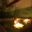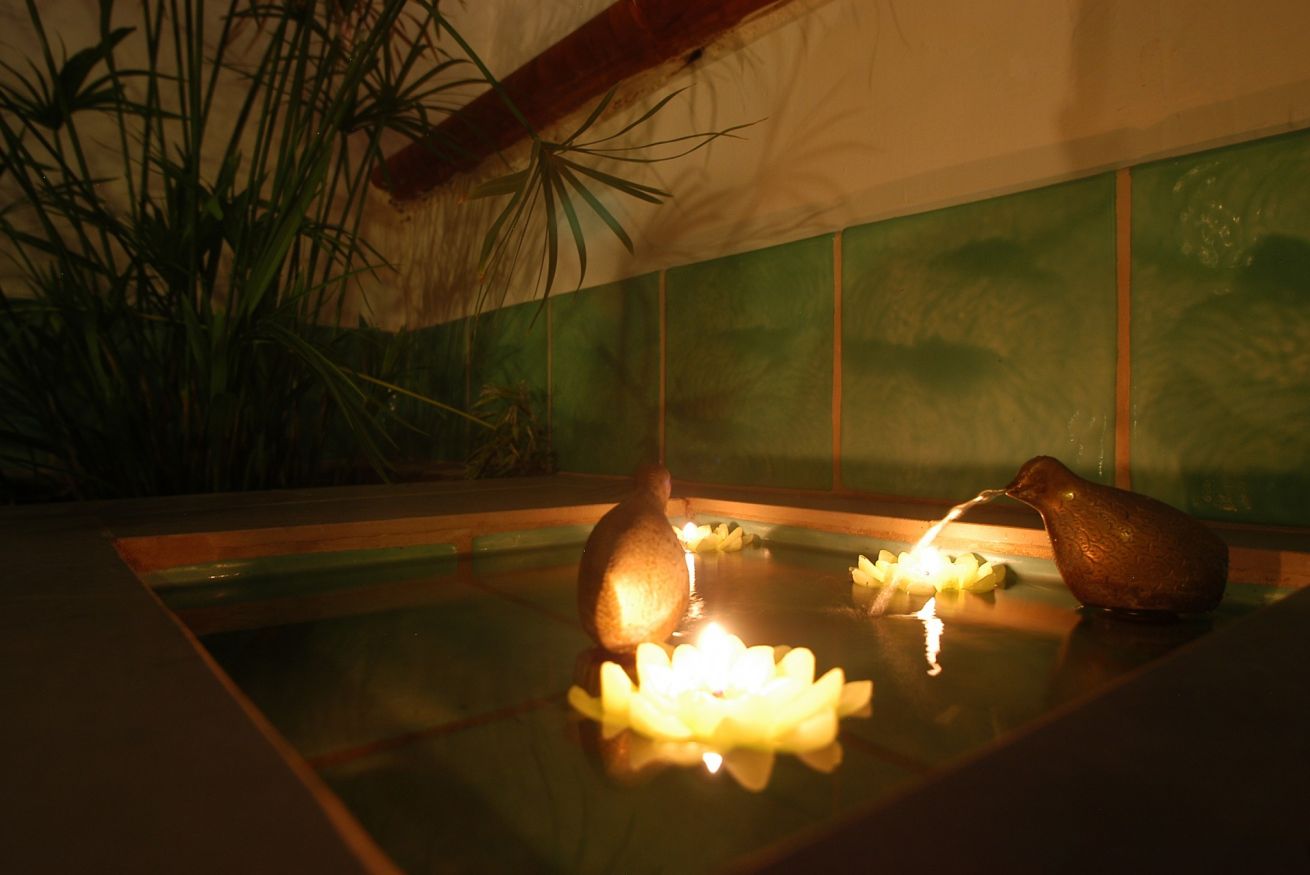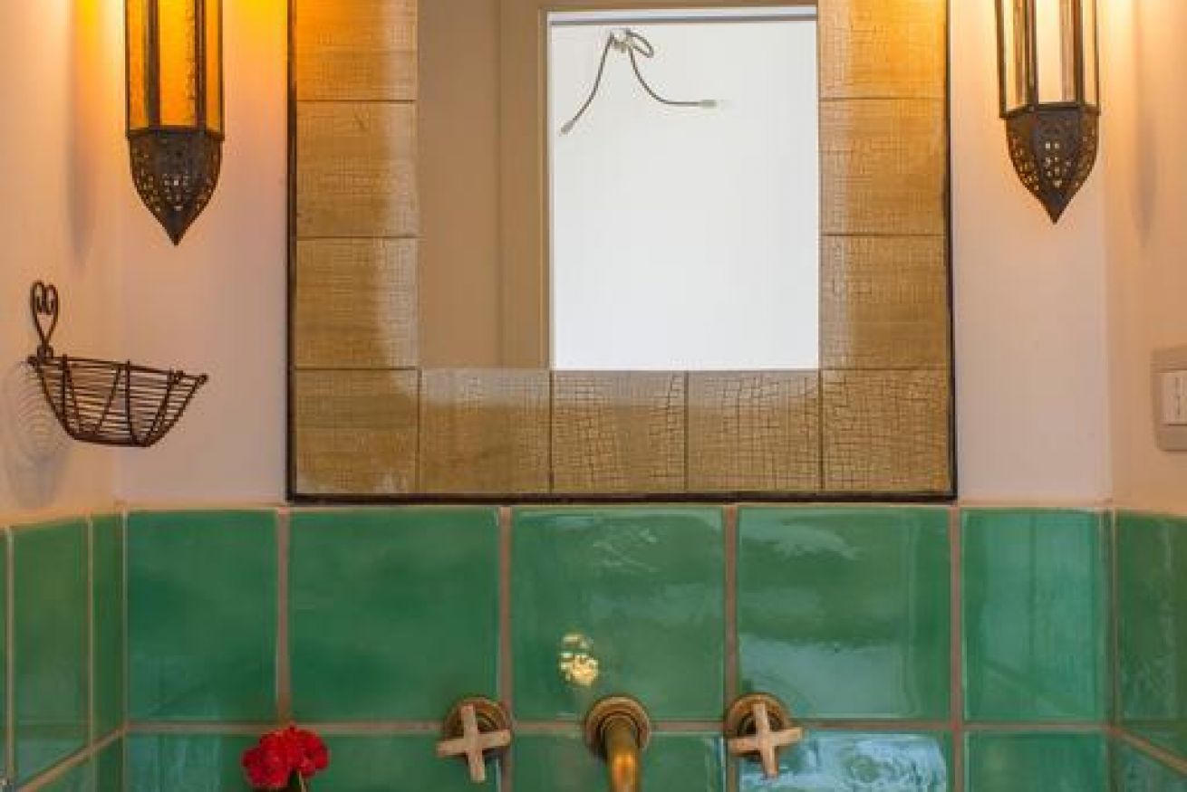 Sulla suggestiva terrazza tavoli maiolicati sono posti sotto uno cannucciato; orci in cotto, fioriere in muratura, piccoli vasi dalle forme zoomorfe e ceramiche siciliane antropomorfe accolgono essenze mediterranee, aromatiche, gelsomini e rose antiche, mentre il mormorio dell’acqua di una piccola incantevole fontana maiolicata fa da sottofondo ai momenti di relax prima e dopo un tuffo nella popolosa vita sottostante.